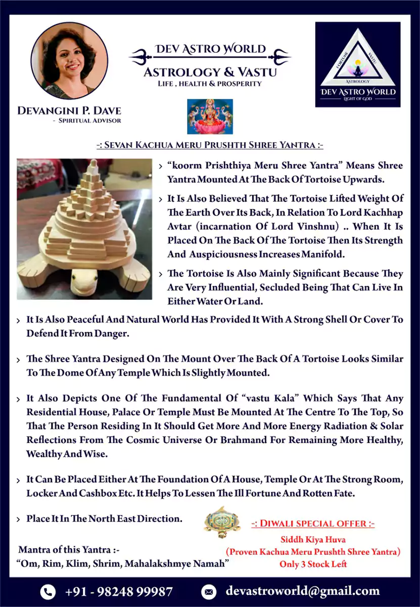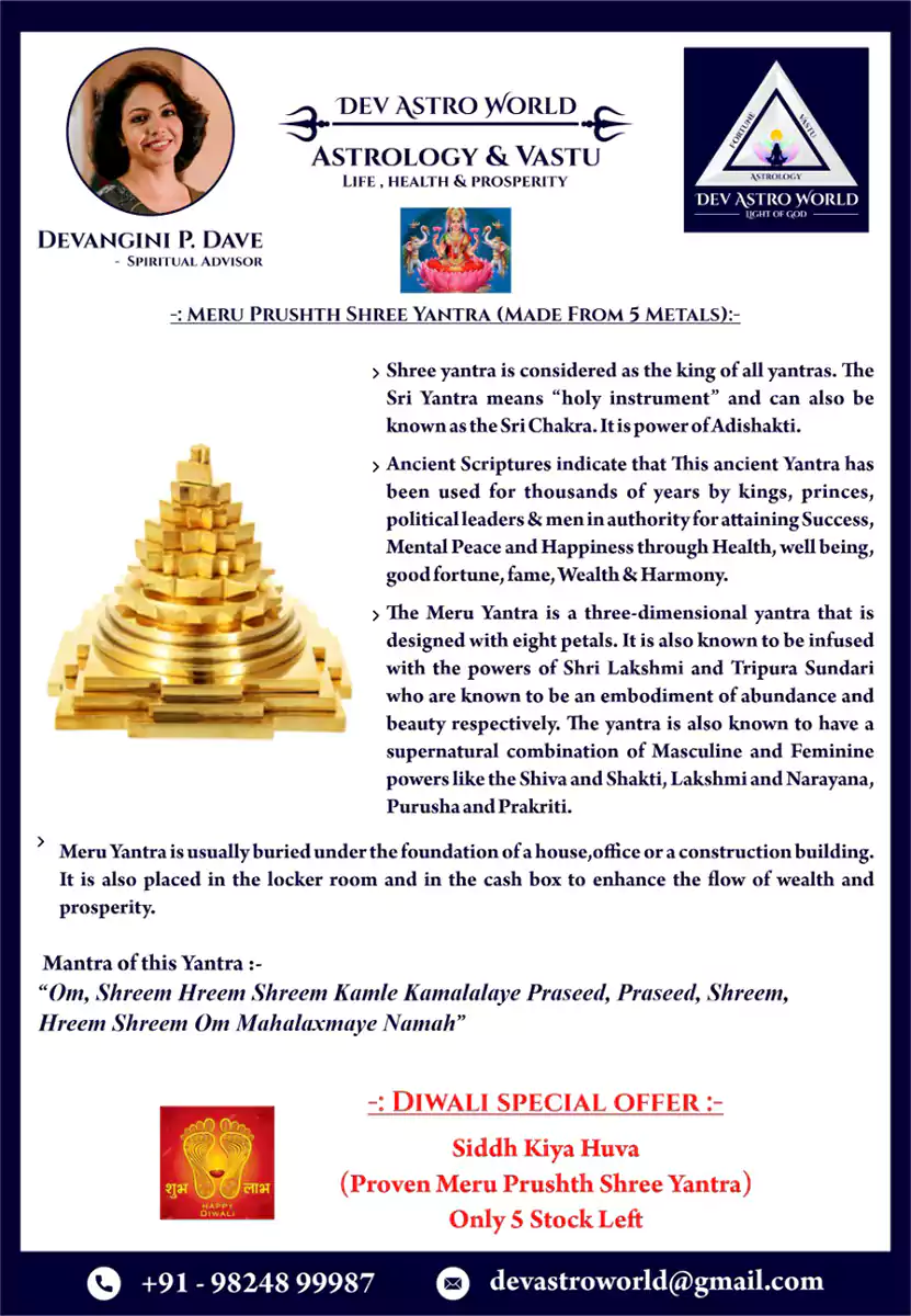 Primarily located in Vadodara, the best astrologer in Vadodara, Dr. Devangini P. Dave is a known Kundali Expert and has made many personal and political predictions accurately. Be it personal life, professional, career, or health one can easily consult and get expert advice. She can also make predictions through palmistry and numerology.